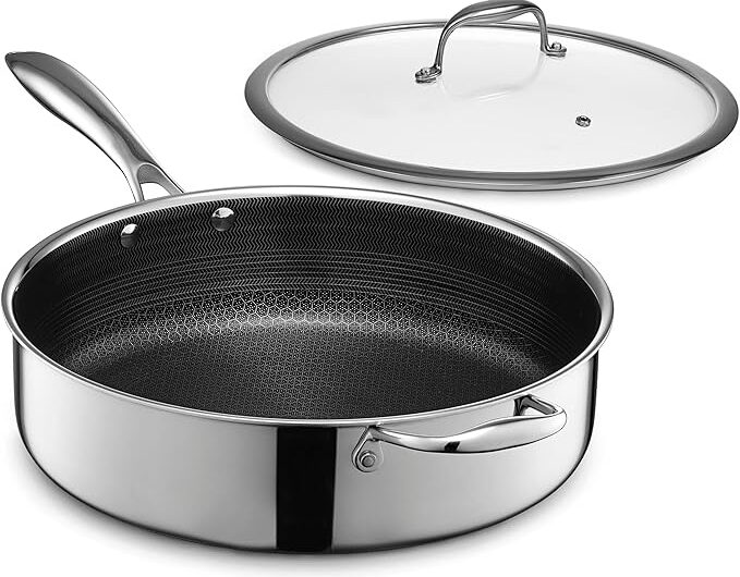 - HexClad Hybrid Nonstick 5.5-Quart Deep Sauté Pan with Tempered Glass Lid, Stay-Cool Handle, Dishwasher-Friendly, Oven-Safe Up to 900°F, Induction Ready, Compatible with All Cooktops